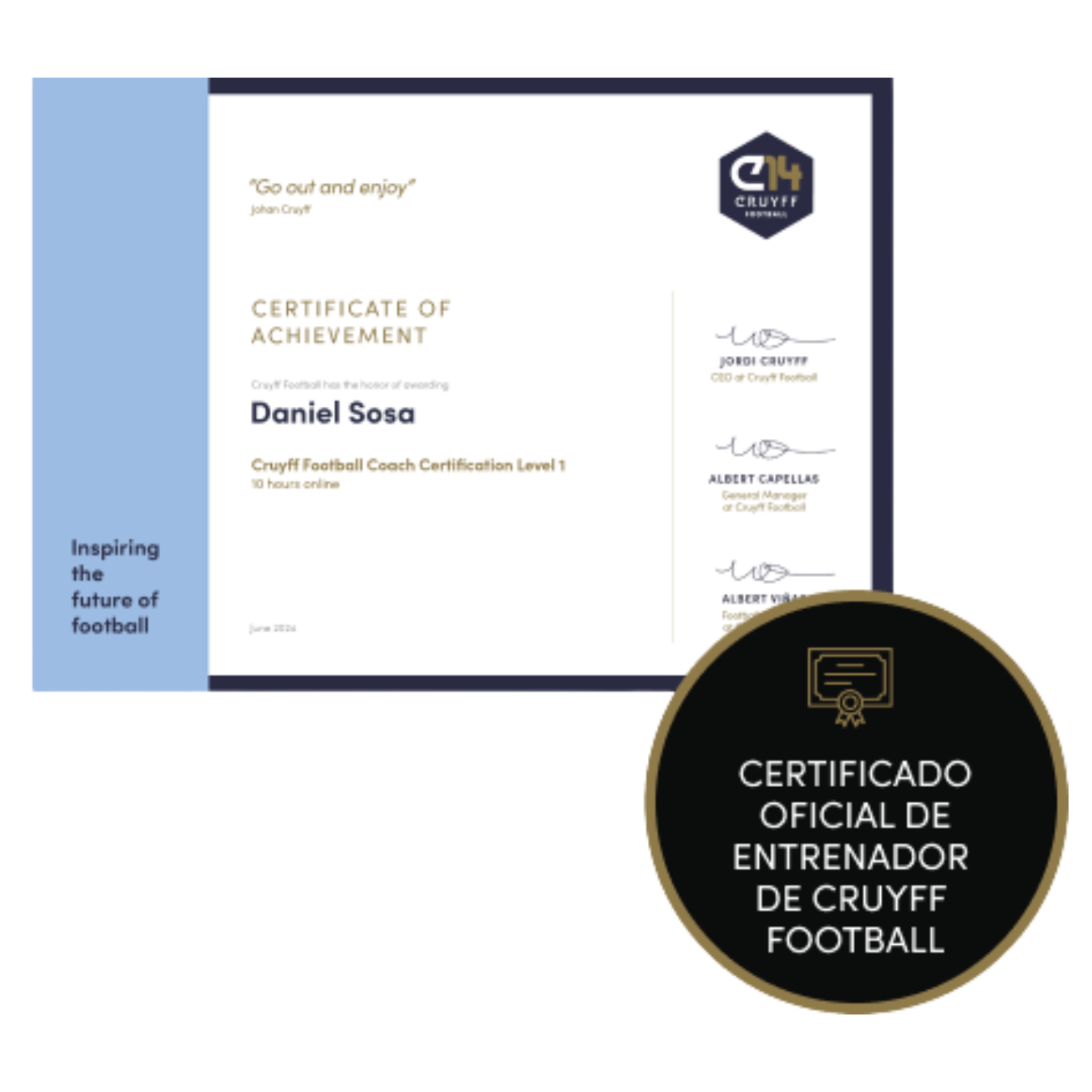 Inspirado en el legendario Johan Cruyff, un visionario en el fútbol cuyo enfoque único continúa impactando en el juego.Las certificaciones incorporan su filosofía para mejorar el rendimiento del equipo y de los jugadores, centrándose en la competencia técnica, la toma de decisiones y la creatividad. Se trata de cursos integrales diseñados para desarrollar habilidades efectivas de entrenamiento, preparando a los entrenadores para alcanzar la excelencia en el fútbol.